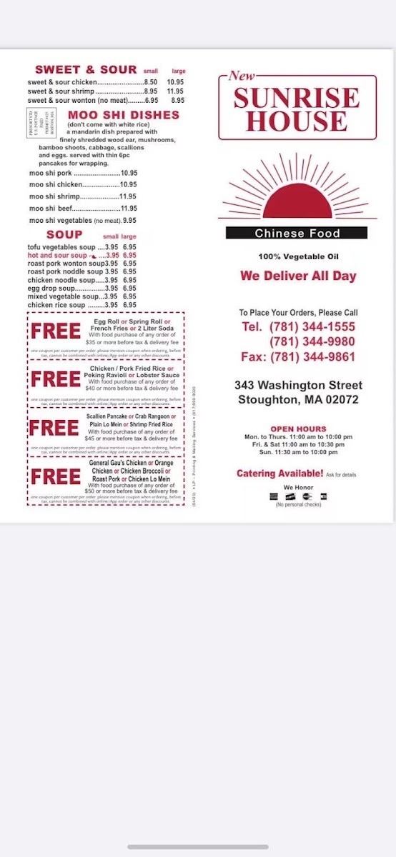 Welcome to Sunrise House, a beloved gem located at 343 Washington St, Stoughton, MA. This casual Chinese food spot delights locals with its consistently high-quality dishes that have stood the test of time. Regulars rave about the chicken chow mein paired with succulent wings, often turning to it as comfort food.
